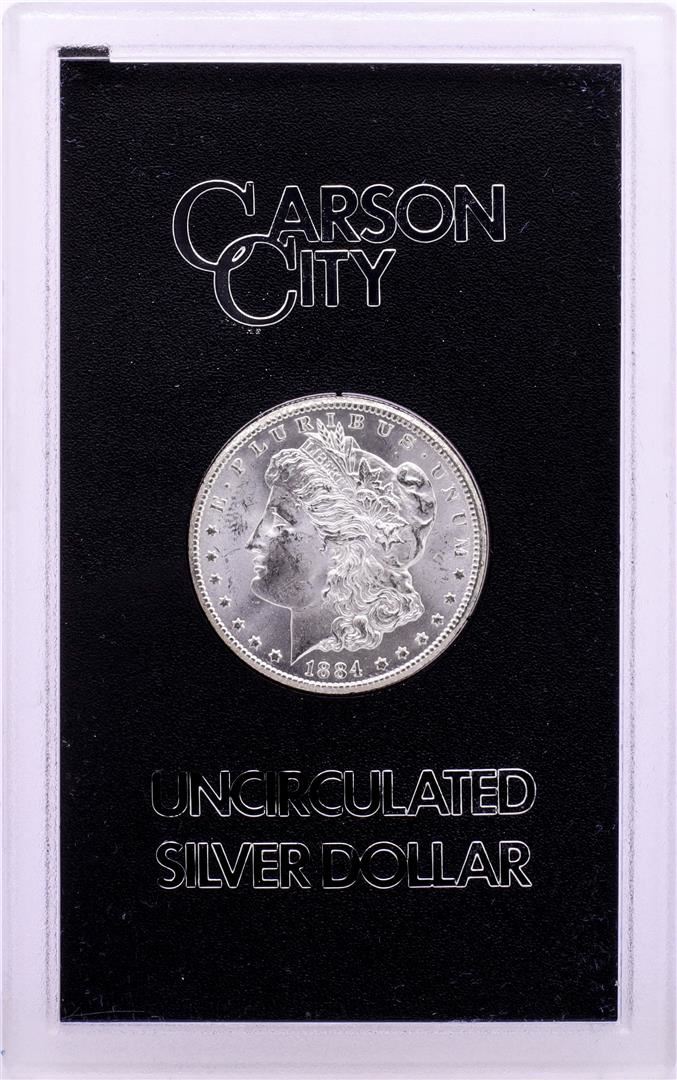 One 1884-CC $1 Morgan Silver Dollar Coin GSA Hoard Uncirculated w/Box & COA.