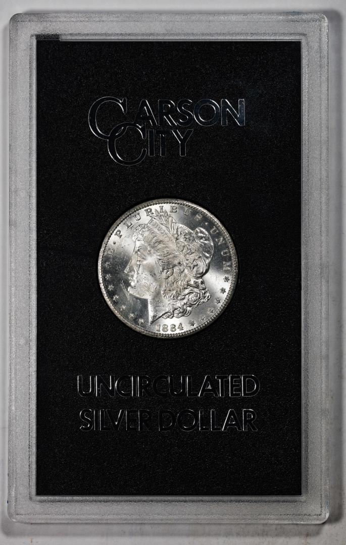 One 1884-CC $1 Morgan Silver Dollar Coin GSA Hoard Uncirculated w/Box & COA.