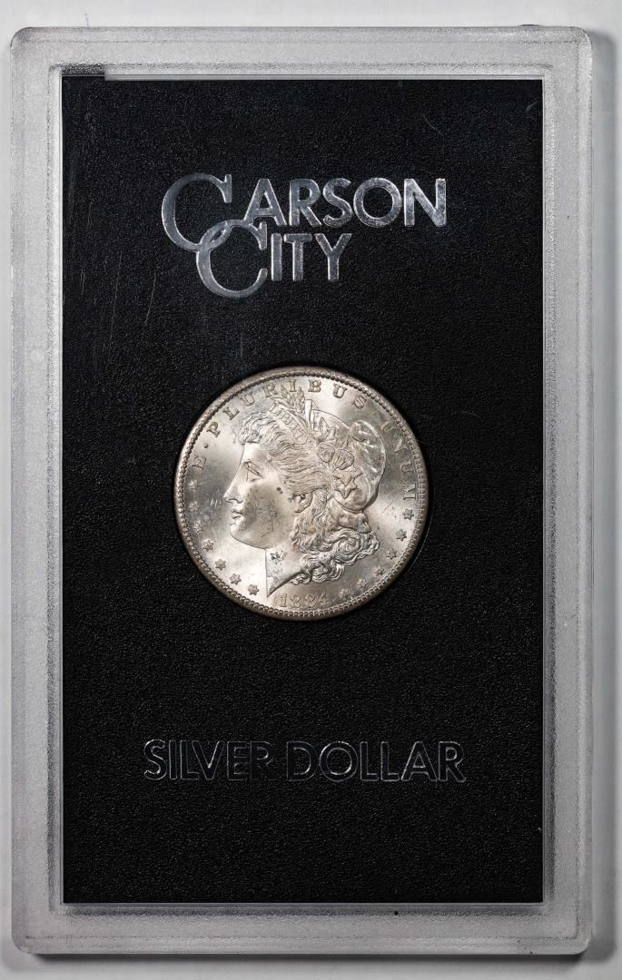 One 1884-CC $1 Morgan Silver Dollar Coin GSA Hoard Uncirculated w/Box.