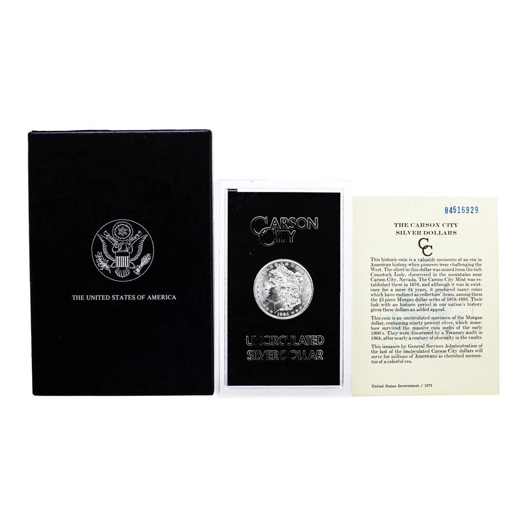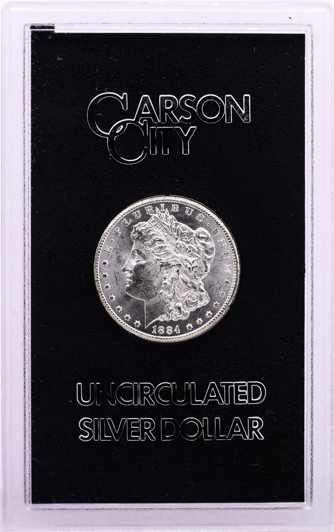 One 1884-CC $1 Morgan Silver Dollar Coin GSA Hoard Uncirculated with Box & COA.