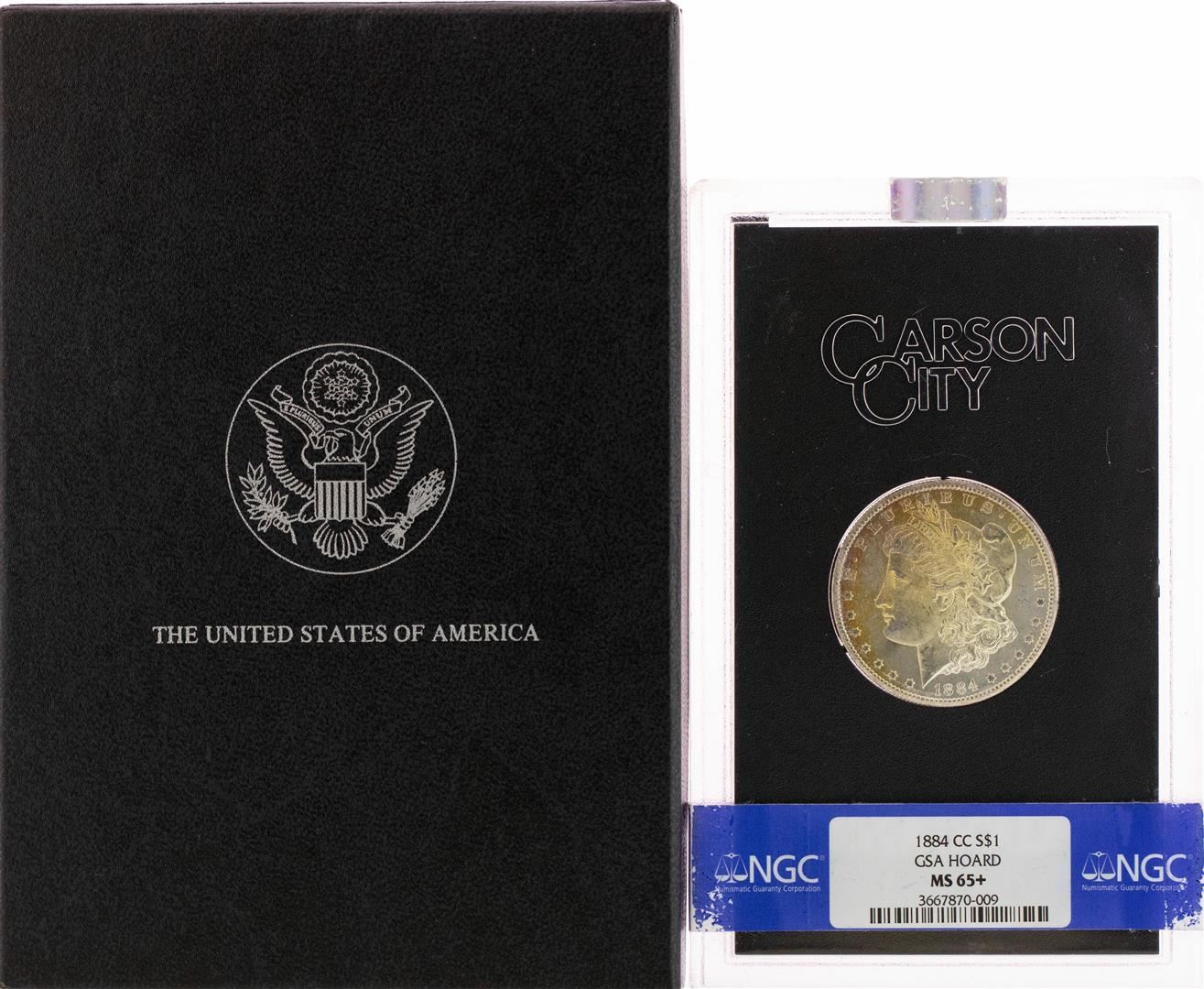 One 1884-CC $1 Morgan Silver Dollar Coin GSA w/ Box NGC MS65+ Nice Toning. NGC Certified.
