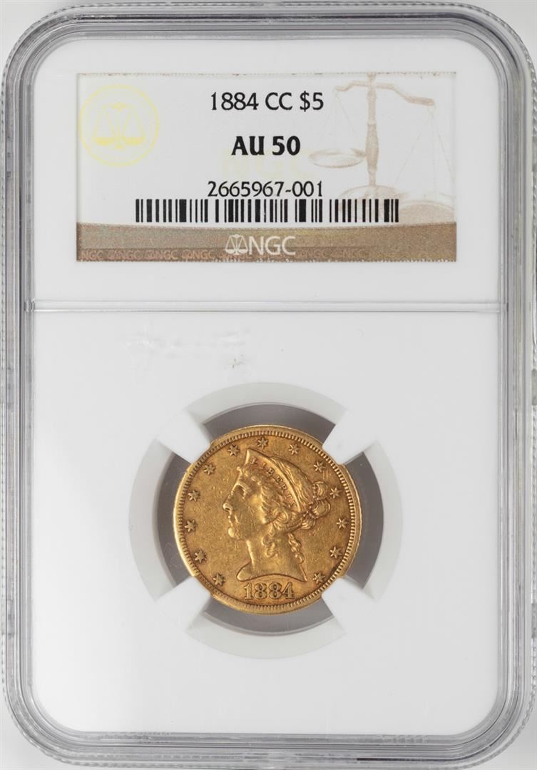 One 1884-CC $5 Liberty Head Half Eagle Gold Coin NGC AU50. NGC Certified.