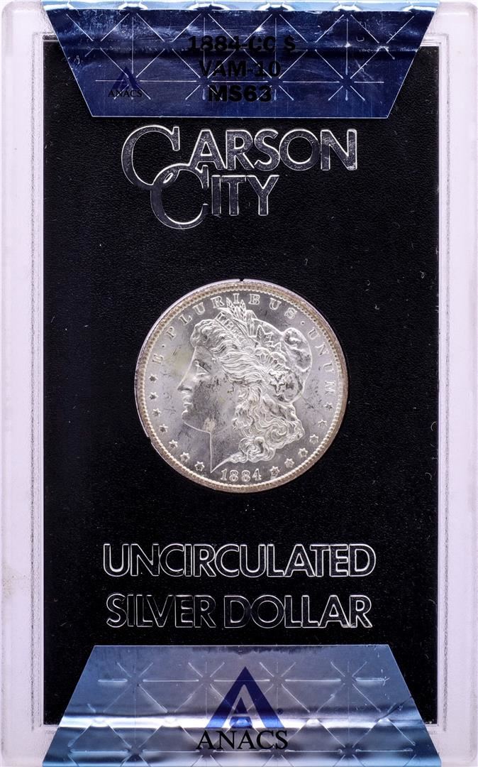 One 1884-CC VAM-10 $1 Morgan Silver Dollar Coin GSA Hoard Uncirculated w/Box ANACS MS63. ANACS Certified.