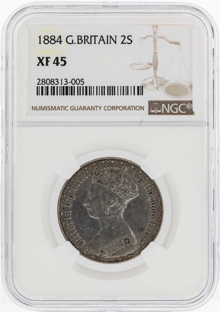 One 1884 Great Britain 2 Shilling Coin NGC XF45. NGC Certified.