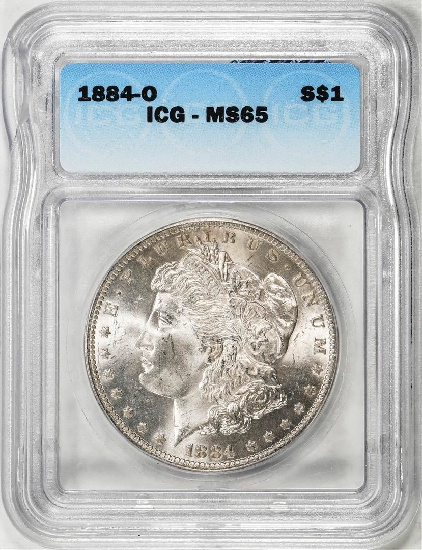 One 1884-O $1 Morgan Silver Dollar Coin ICG MS65, please note the slab has a chip in the upper left corner as shown in the pictures. ICG Certified.