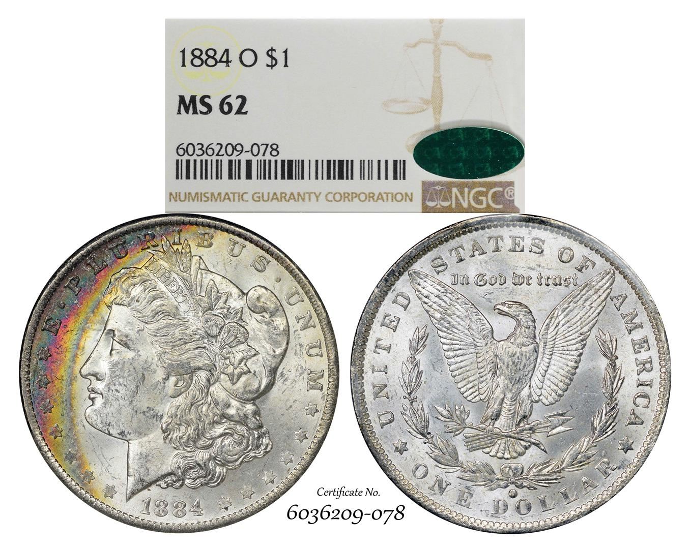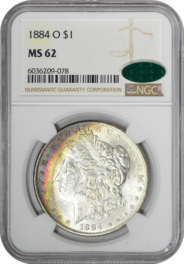 One 1884-O $1 Morgan Silver Dollar Coin NGC MS62 CAC Amazing Toning. NGC Certified.