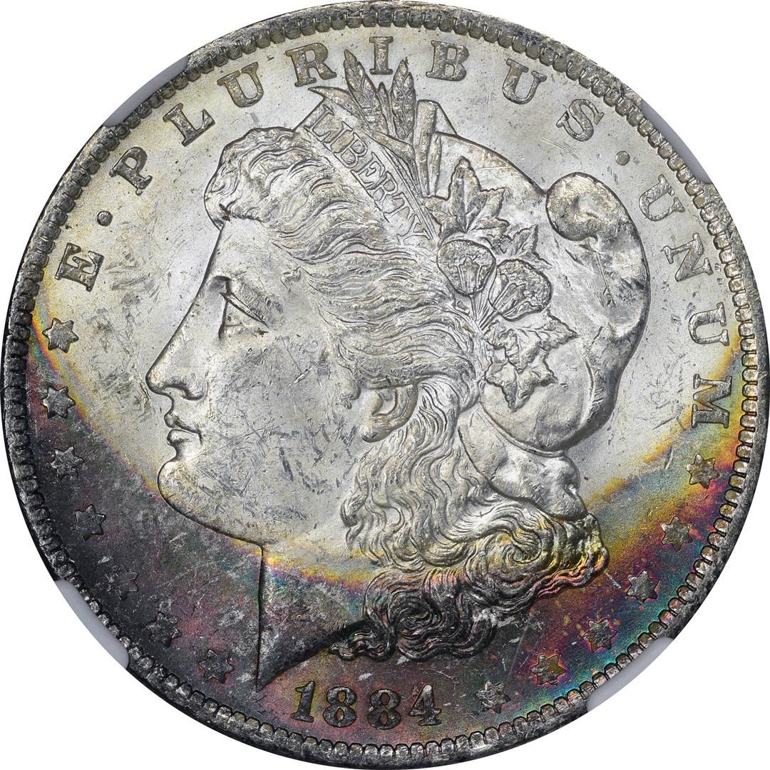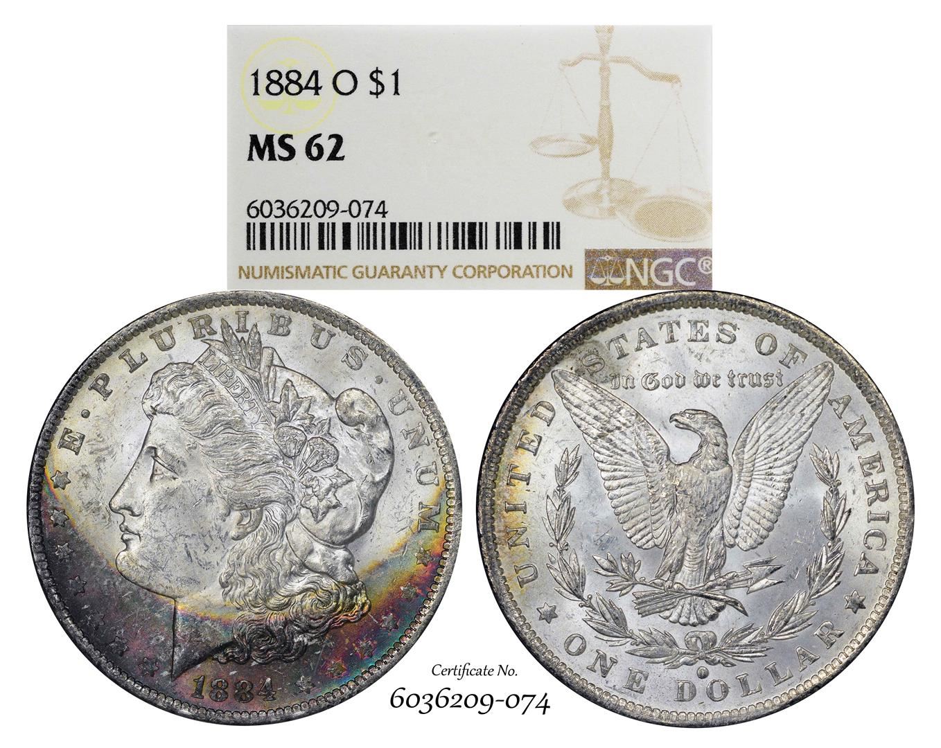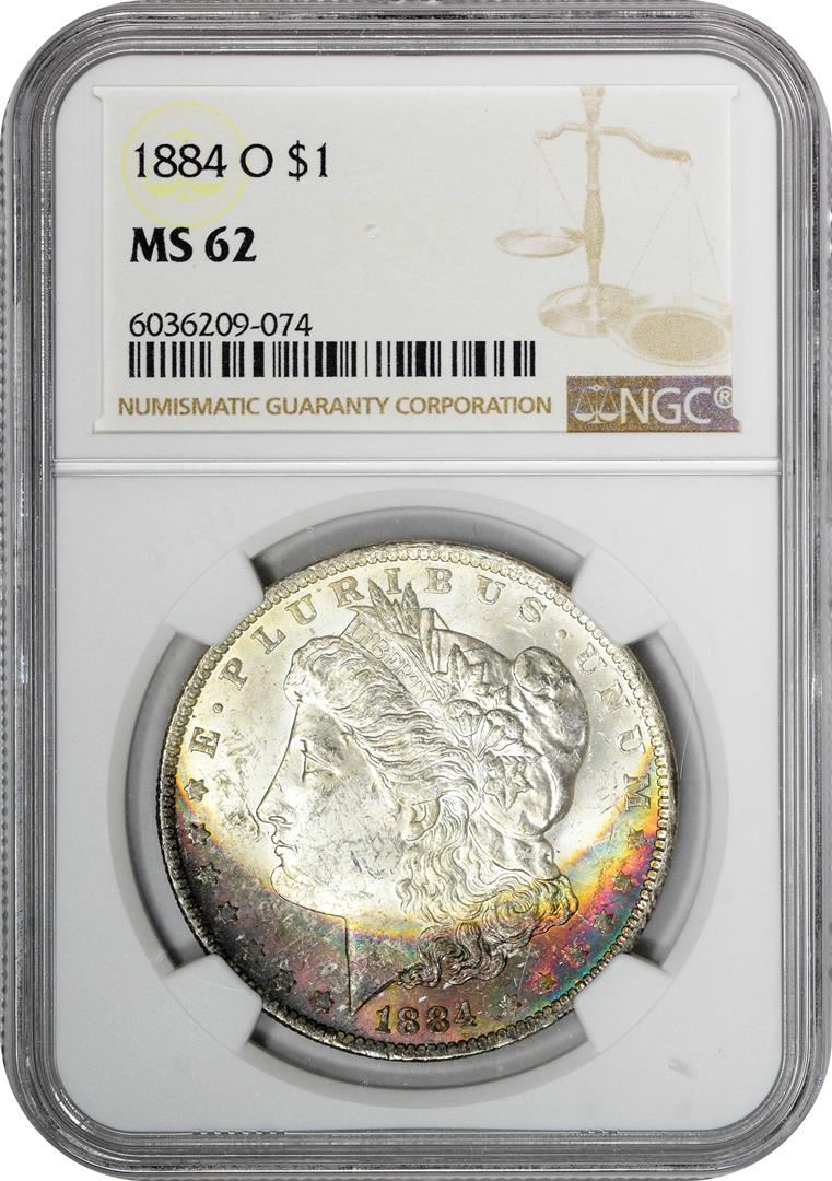 One 1884-O $1 Morgan Silver Dollar Coin NGC MS62 Great Toning. NGC Certified.