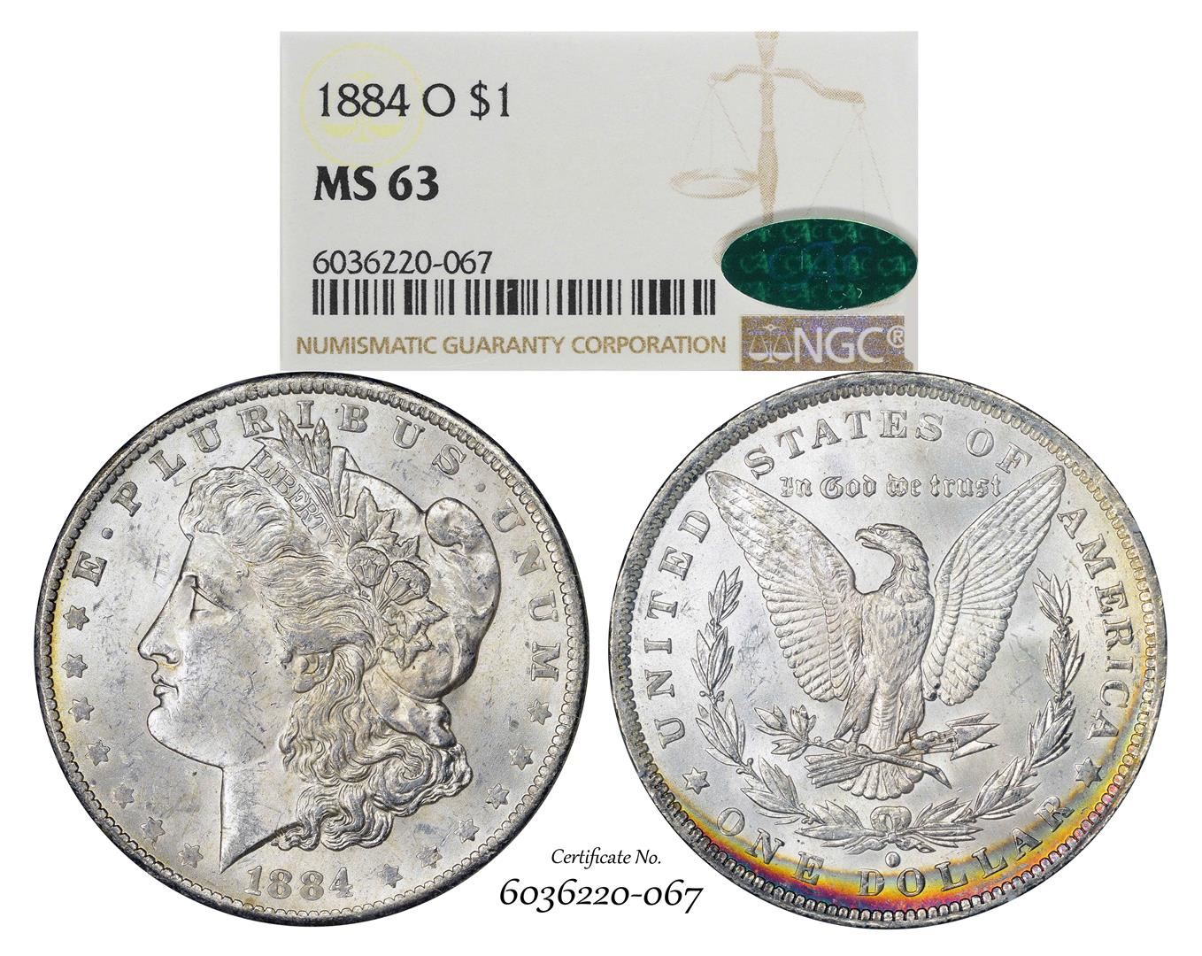 One 1884-O $1 Morgan Silver Dollar Coin NGC MS63 CAC Great Toning. NGC Certified.