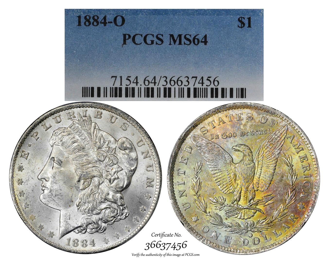 One 1884-O $1 Morgan Silver Dollar Coin PCGS MS64 Amazing Toning.