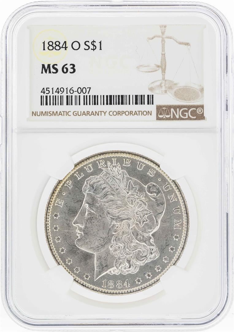 One 1884-O $1 Morgan Silver Dollar Coin w/ Nice Toning NGC MS63. NGC Certified.
