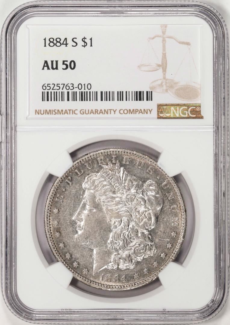 One 1884-S $1 Morgan Silver Dollar Coin NGC AU50. NGC Certified.