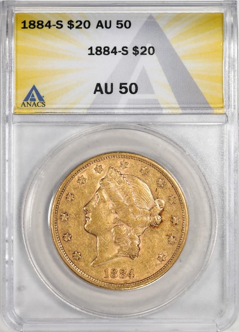 One 1884-S $20 Liberty Head Double Eagle Gold Coin ANACS AU50. ANACS Certified.
