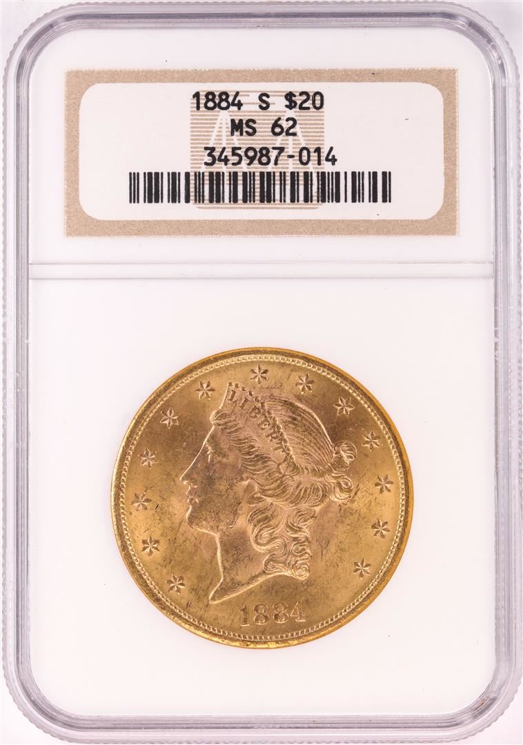 One 1884-S $20 Liberty Head Double Eagle Gold Coin NGC MS62. NGC Certified.