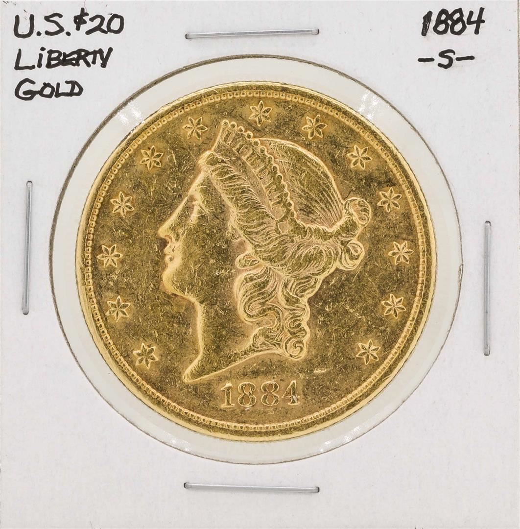 One 1884-S $20 Liberty Head Double Eagle Gold Coin.
