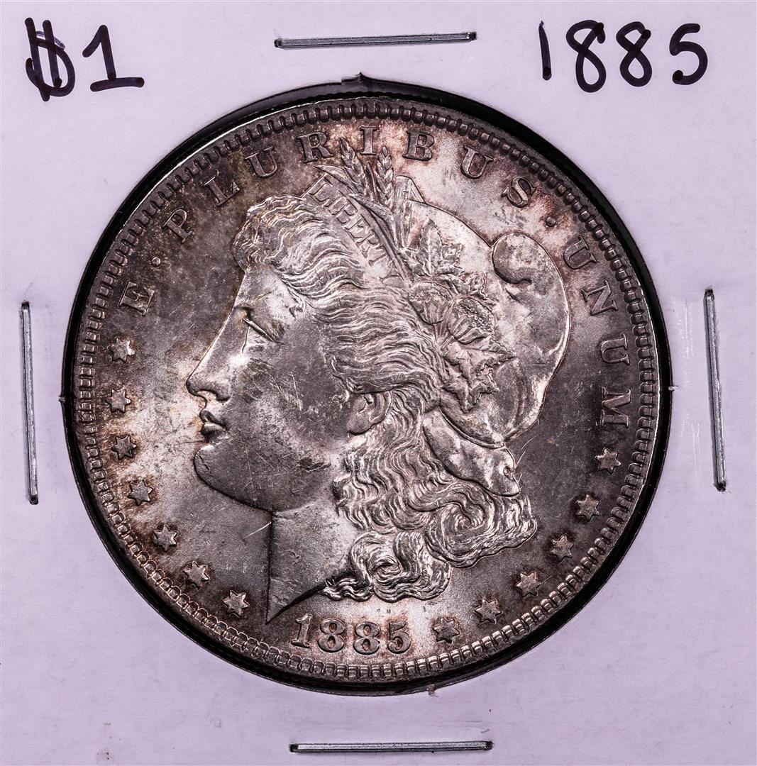 One 1885 $1 Morgan Silver Dollar Coin.