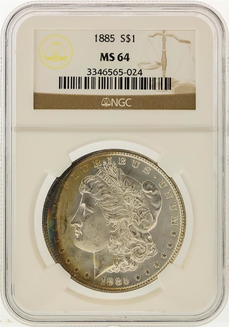 One 1885 $1 Morgan Silver Dollar NGC Graded MS64. NGC Certified.