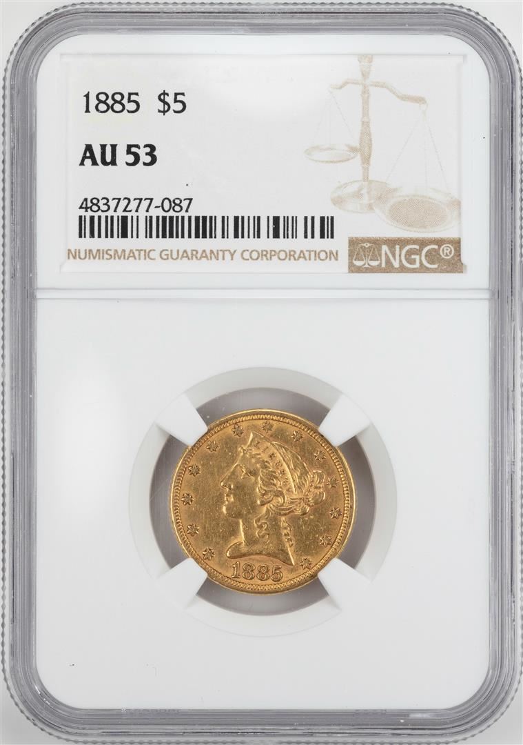 One 1885 $5 Liberty Head Half Eagle Gold Coin NGC AU53. NGC Certified.