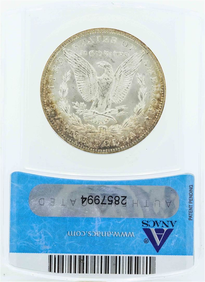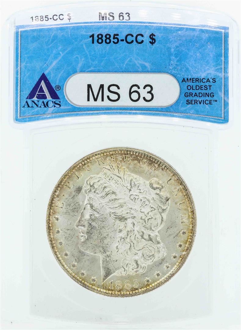 One 1885-CC $1 Morgan Silver Dollar Coin ANACS MS63. ANACS Certified.