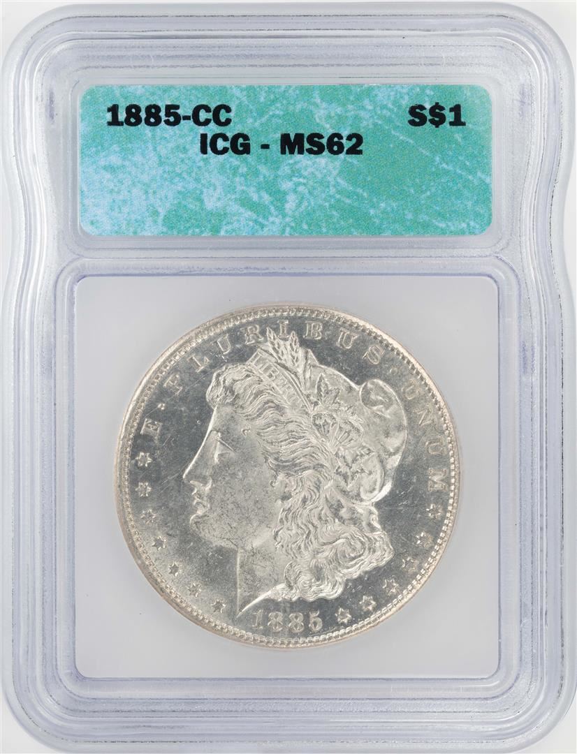 One 1885-CC $1 Morgan Silver Dollar Coin ICG MS62. ICG Certified.
