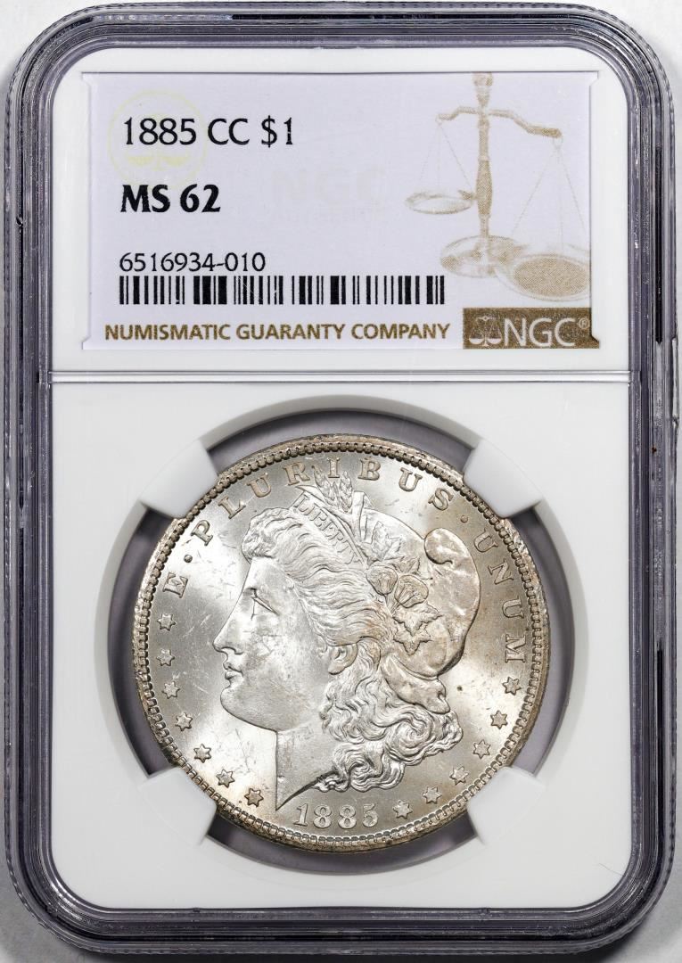One 1885-CC $1 Morgan Silver Dollar Coin NGC MS62. NGC Certified.