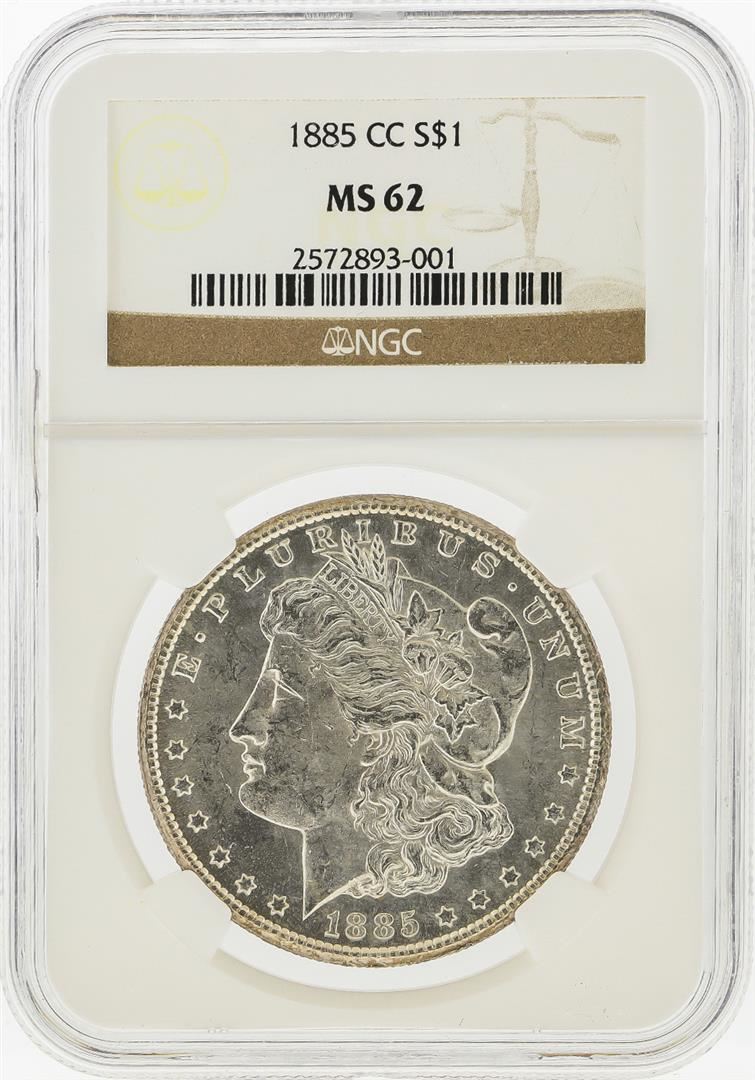 One 1885-CC $1 Morgan Silver Dollar NGC Graded MS62. NGC Certified.