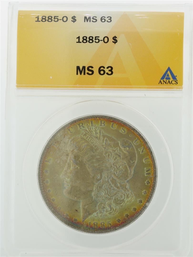 One 1885-O $1 Morgan Silver Dollar ANACS Graded MS63. ANACS Certified.