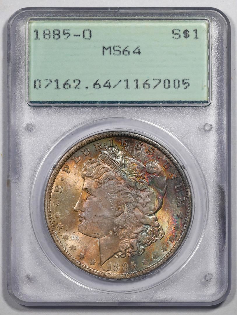 One 1885-O $1 Morgan Silver Dollar Coin PCGS MS64 Old Green Holder Amazing Toning. PCGS Graded.