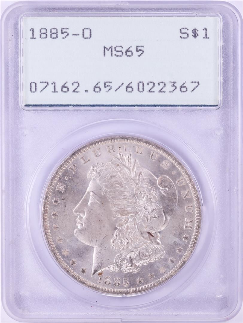 One 1885-O $1 Morgan Silver Dollar Coin PCGS MS65 Green Rattler Holder. PCGS Graded.
