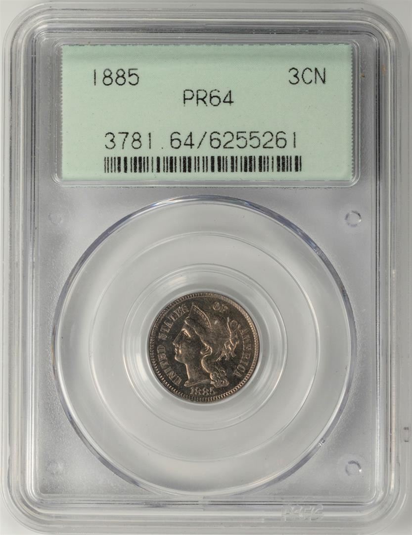 One 1885 Proof Three Cent Nickel Coin PCGS PR64 Old Green Holder. PCGS Graded.