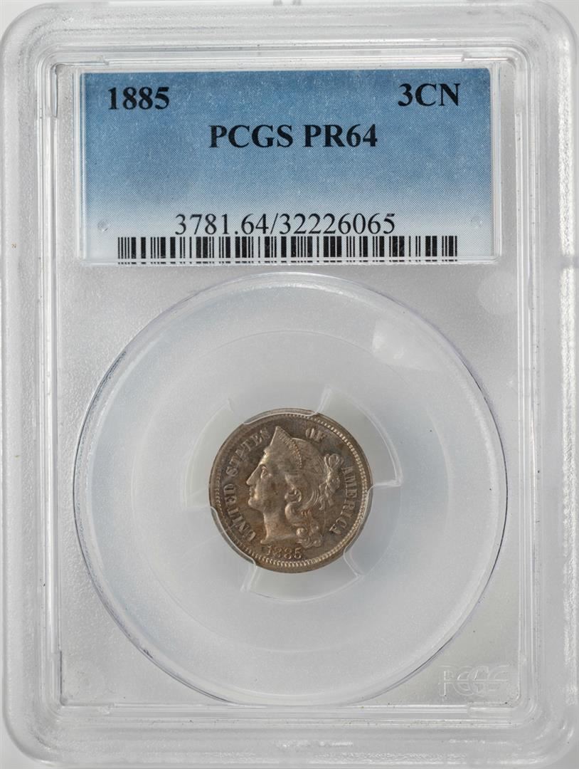 One 1885 Proof Three Cent Nickel Coin PCGS PR64. PCGS Graded.