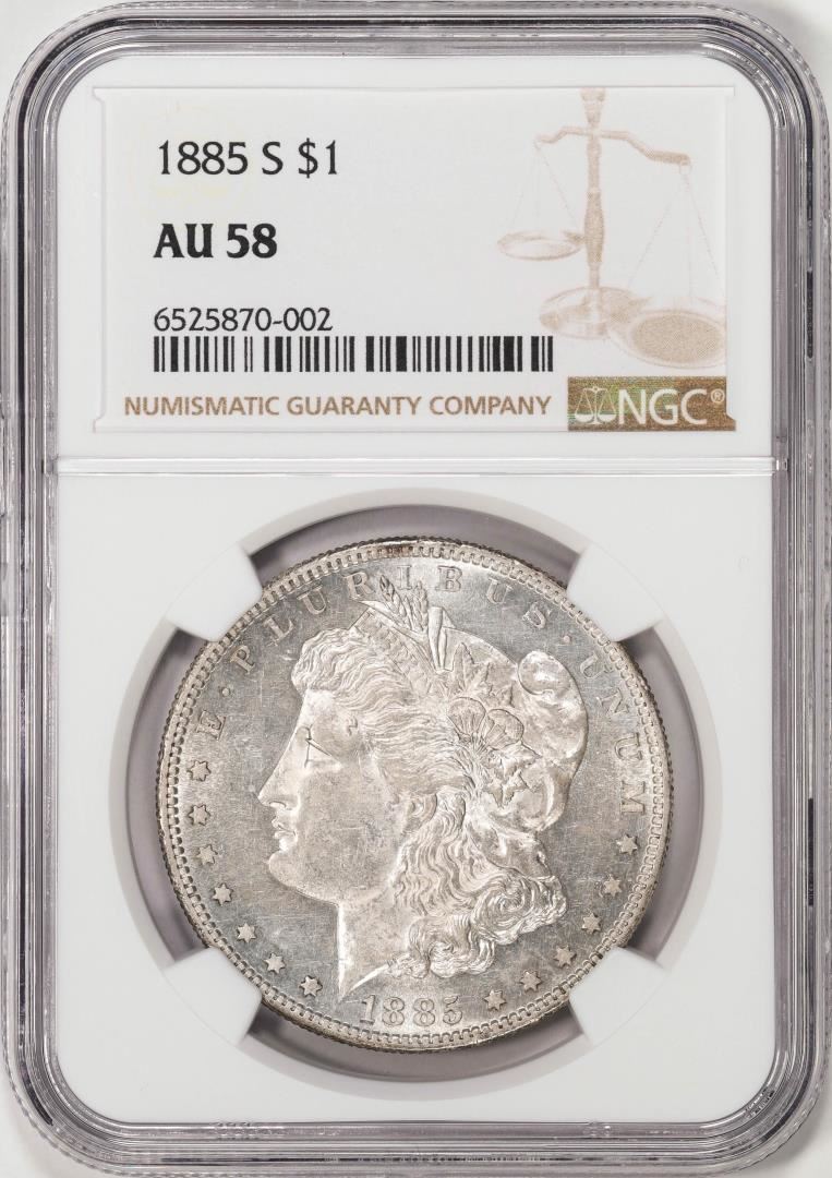 One 1885-S $1 Morgan Silver Dollar Coin NGC AU58. NGC Certified.