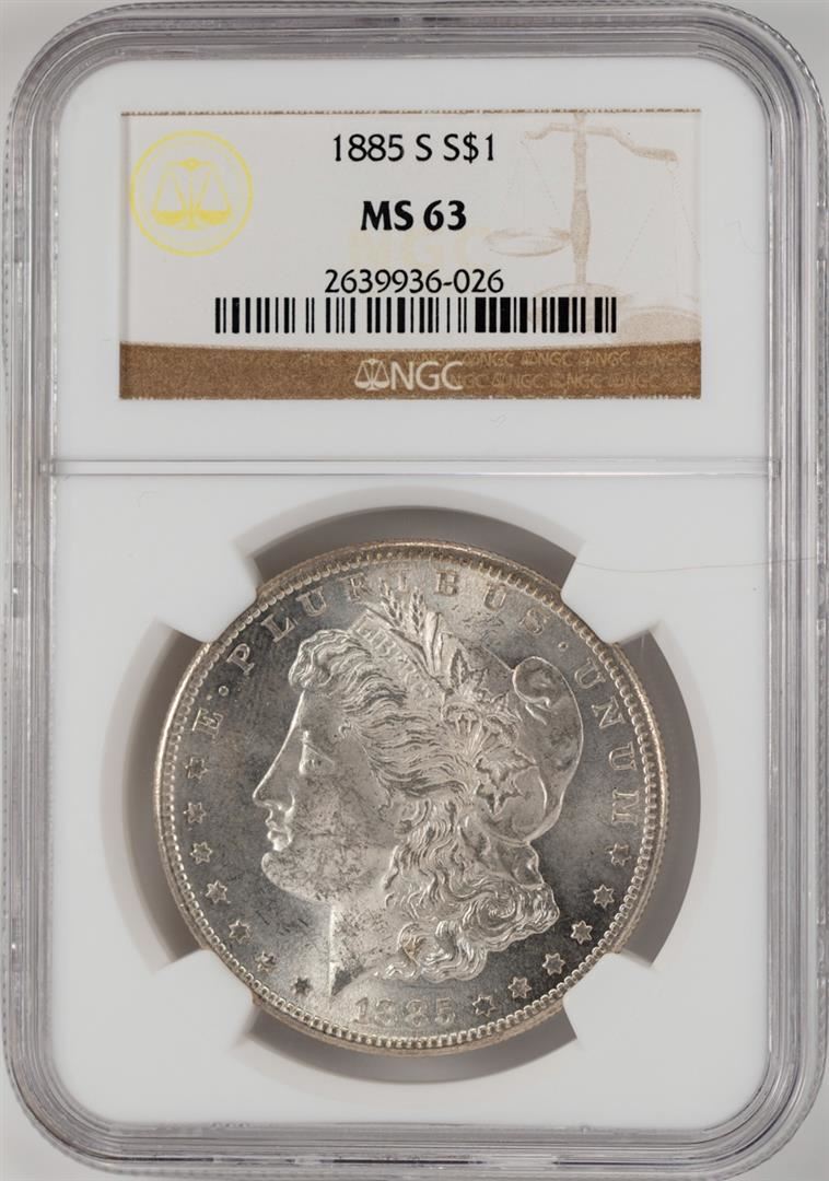 One 1885-S $1 Morgan Silver Dollar Coin NGC MS63. NGC Certified.