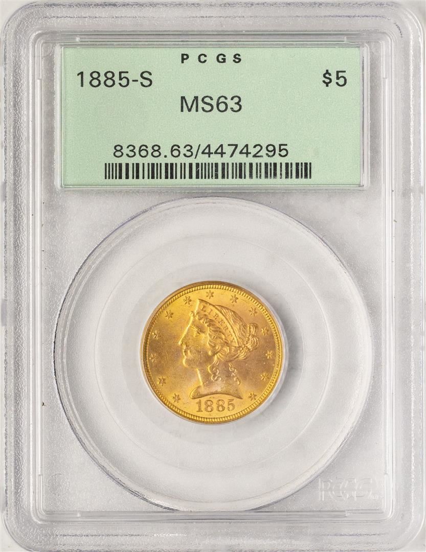 One 1885-S $5 Liberty Head Half Eagle Gold Coin PCGS MS63 Old Green Holder. PCGS Graded.