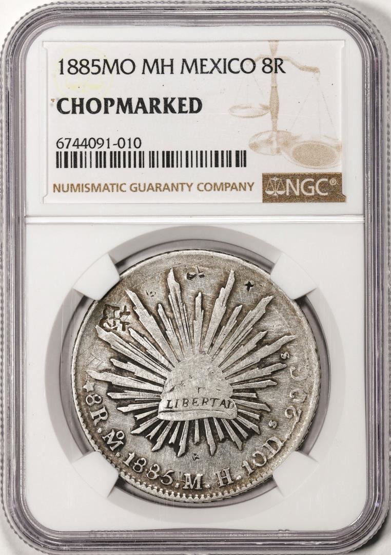 One 1885MO MH Mexico 8 Reales Silver Coin NGC Chopmarked. NGC Certified.