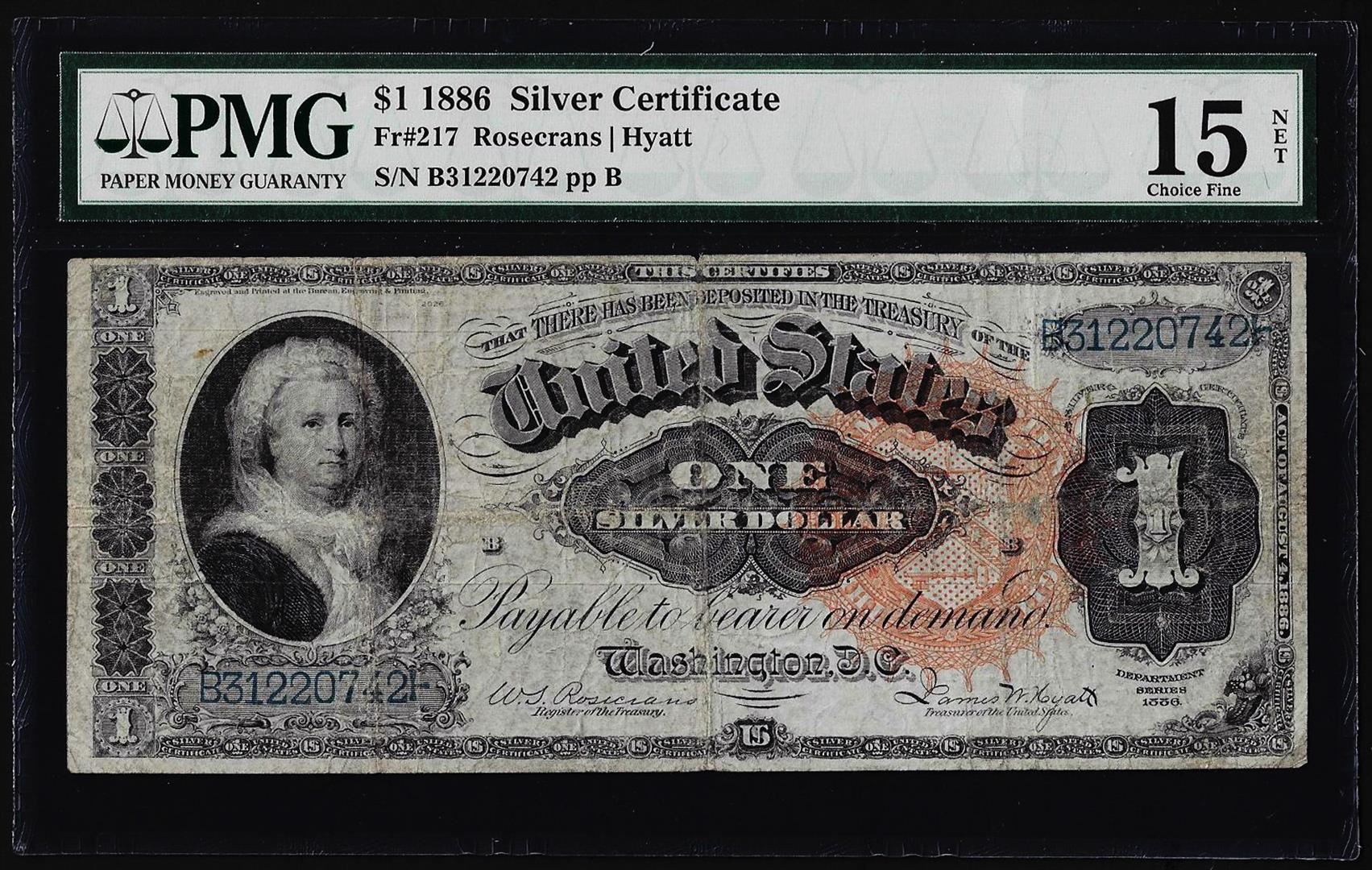One 1886 $1 Martha Washington Silver Certificate Note Fr.217 PMG Choice Fine 15 Net. PMG Certified.