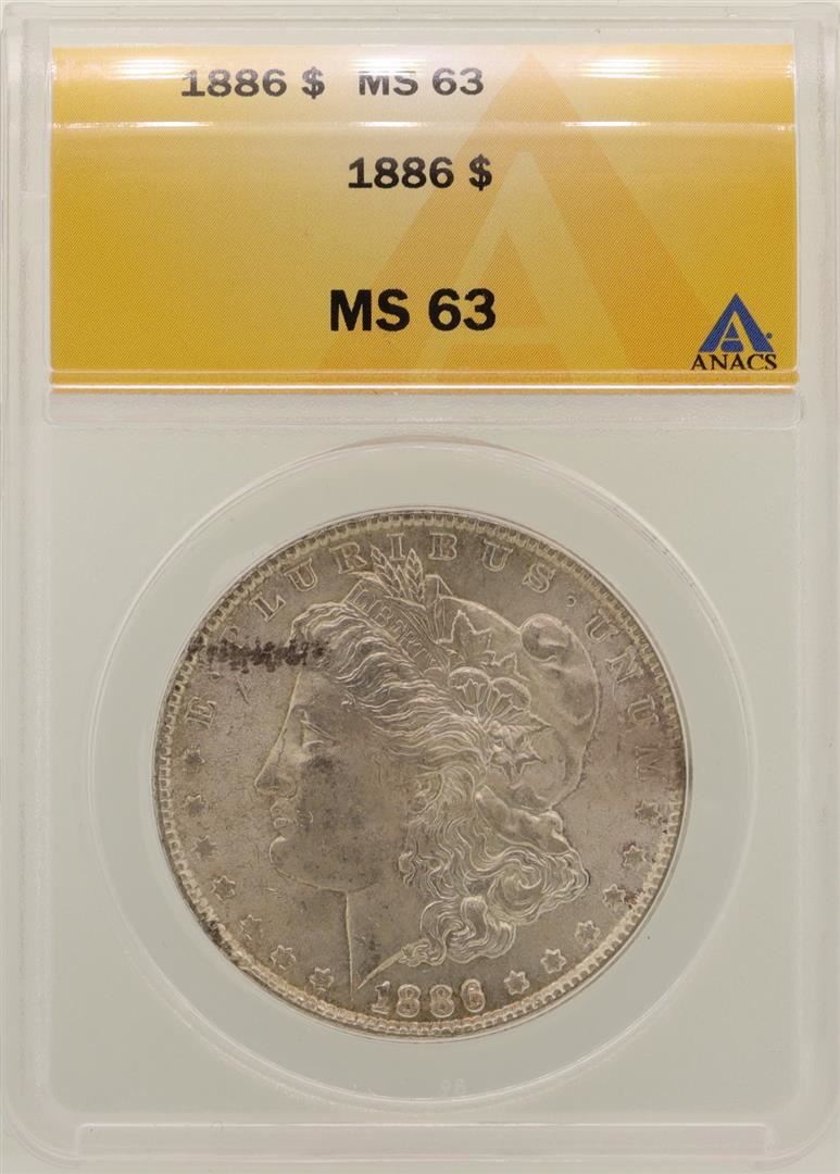 One 1886 $1 Morgan Silver Dollar Coin ANACS MS63. ANACS Certified.