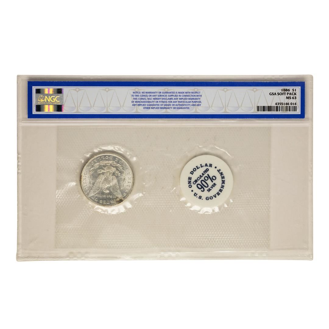 One 1886 $1 Morgan Silver Dollar Coin GSA Soft Pack NGC MS63. NGC Certified.