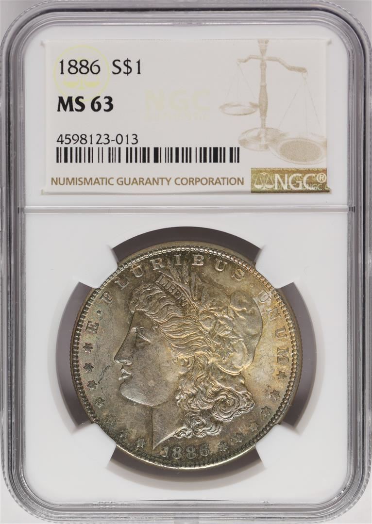 One 1886 $1 Morgan Silver Dollar Coin NGC MS63 Nice Toning. NGC Certified.