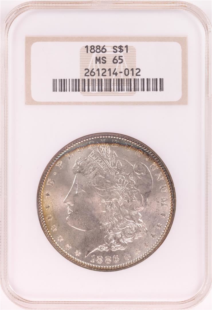 One 1886 $1 Morgan Silver Dollar Coin NGC MS65 Nice Toning Old Holder. NGC Certified.