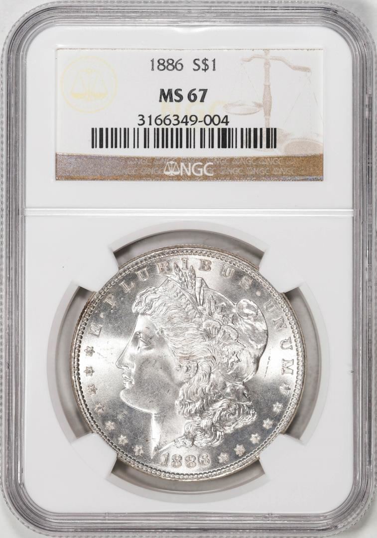 One 1886 $1 Morgan Silver Dollar Coin NGC MS67. NGC Certified.