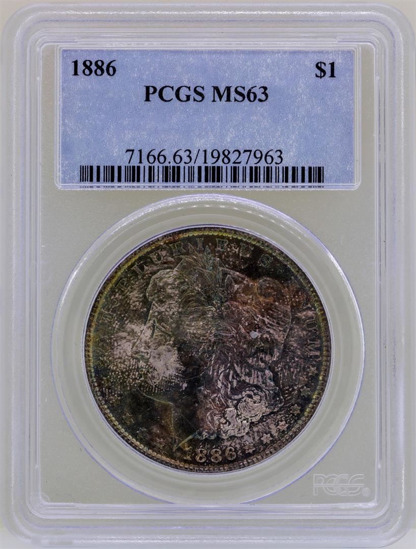 One 1886 $1 Morgan Silver Dollar Coin PCGS MS63 Amazing Toning. PCGS Graded.