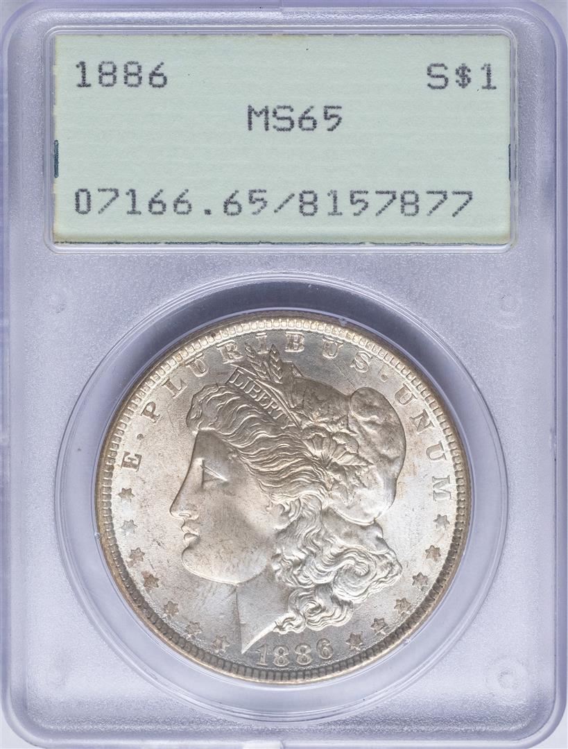 One 1886 $1 Morgan Silver Dollar Coin PCGS MS65 Old Green Rattler. PCGS Graded.