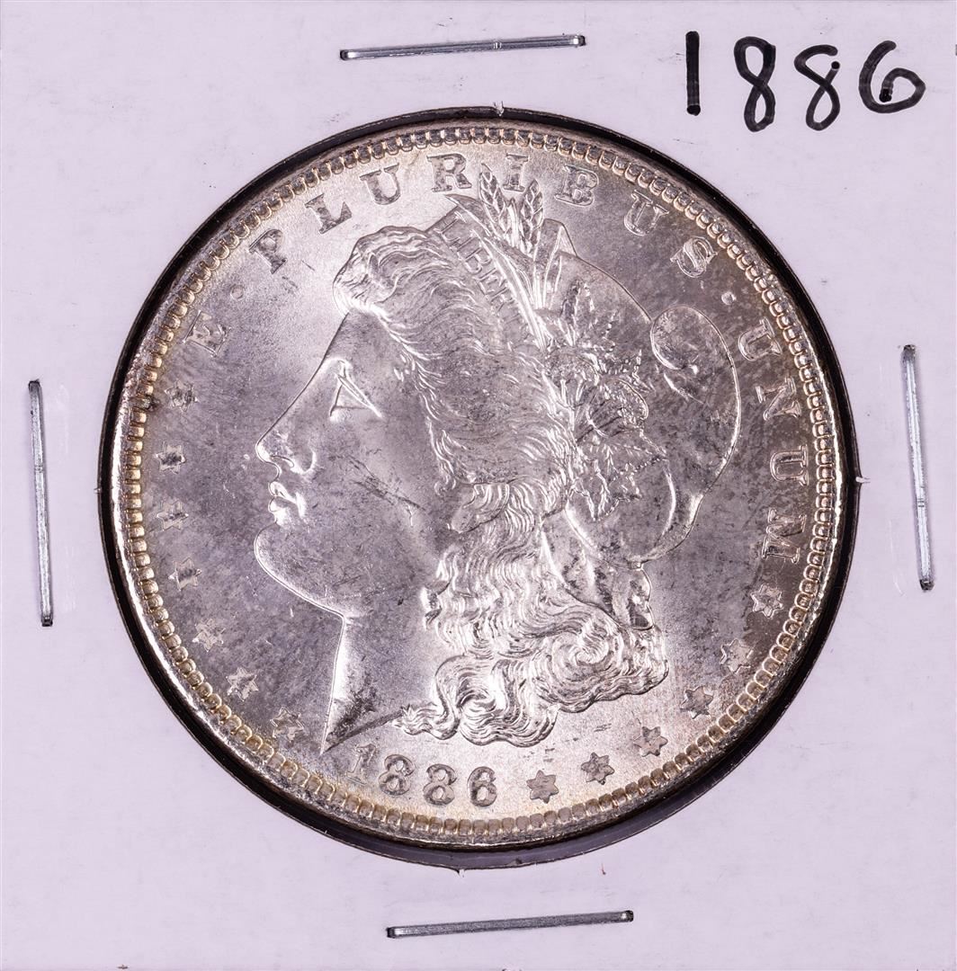 One 1886 $1 Morgan Silver Dollar Coin.