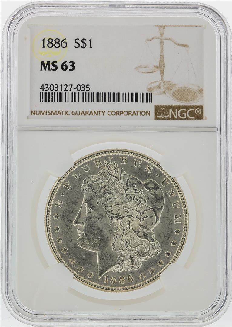 One 1886 $1 Morgan Silver Dollar NGC Graded MS63. NGC Certified.