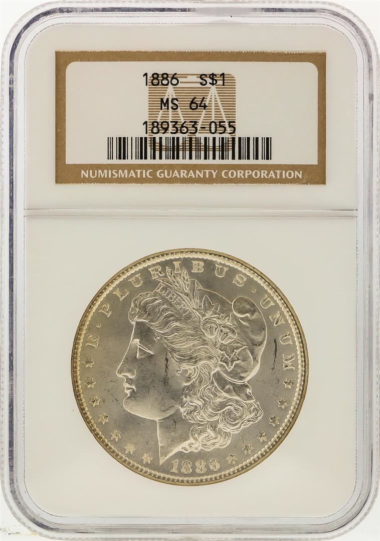 One 1886 $1 Morgan Silver Dollar NGC Graded MS64. NGC Certified.