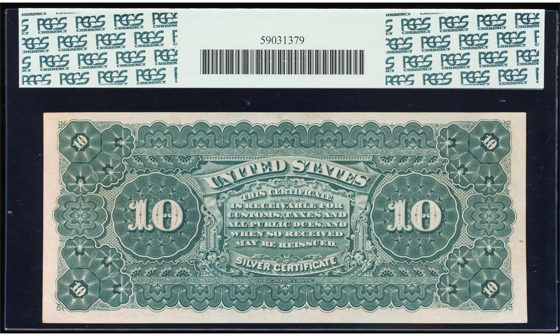 One 1886 $10 Tombstone Silver Certificate Note Fr.294 PCGS Graded Choice About New 58PPQ. The present piece is extremely appealing with excellent margins and centering. Strong overprints contrast nicely to its creamy off white paper which allows the bold large peach seal to really stand out. The embossing can easily be seen through its busy yet intricate back design. PCGS Graded.