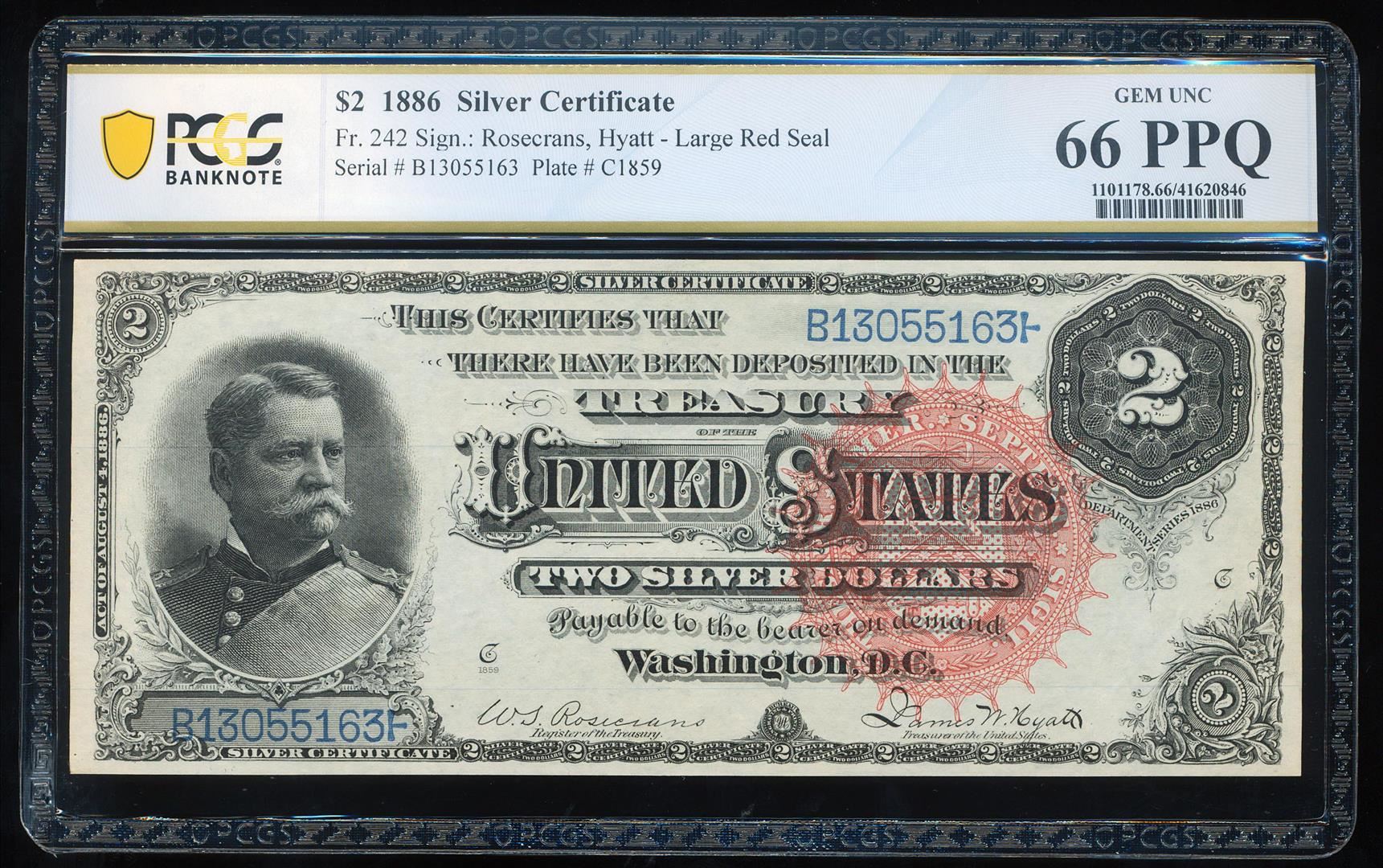 One 1886 $2 Silver Certificate Note Fr.242 PCGS Gem Uncirculated 66PPQ. PCGS Graded.