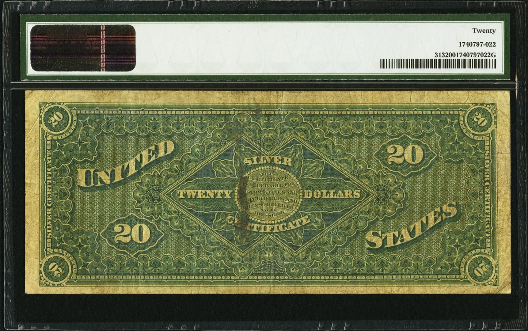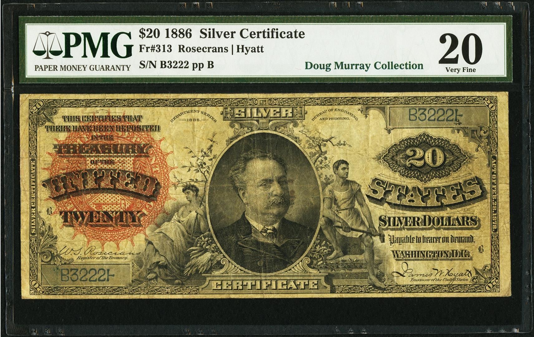 1886 $20 Manning Silver Certificate Note Fr.313 PMG Graded Very Fine 20. A rare note with this Fr. 313 being one of only 19 serial numbers listed in a recent survey. Three of those pieces can be found at the Federal Reserve Bank of Chicago, the Smithsonian Institution, and the ANA Museum. That leaves only a paltry 16 for collectors to fight over. PMG Certified.