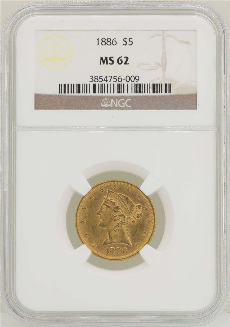 One 1886 $5 Liberty Head Half Eagle Gold Coin NGC MS62. NGC Certified.