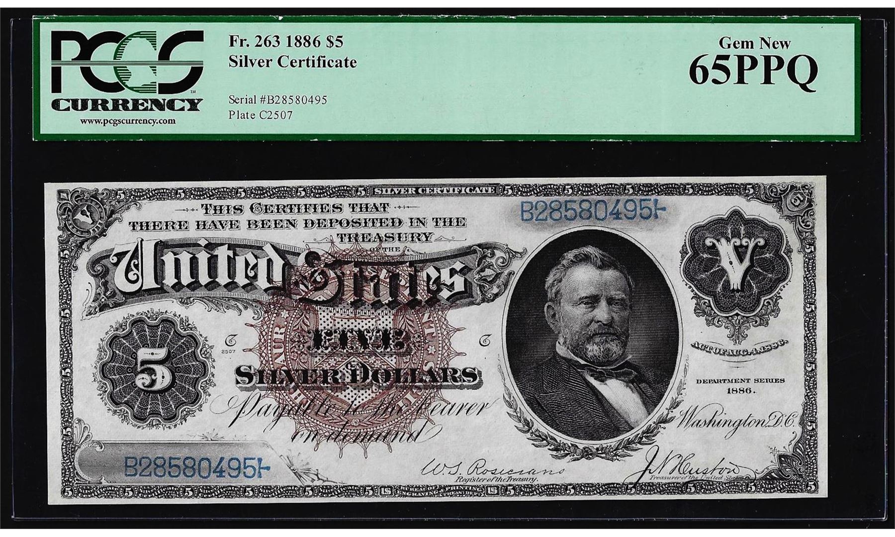 One 1886 $5 Silver Certificate Note Fr.263 PCGS Graded Gem New 65PPQ. A pleasing example of this iconic note. The big brown seal on the face sits in perfect contrast to the creamy white paper. The five Morgan Silver Dollars on back signify the note was backed by Silver, as was the case for all Silver Certificates at the time which had an equivalent number of coins were sitting in Treasury Vaults. Four even margins frame the design and the printed details are crisp. PCGS Graded.